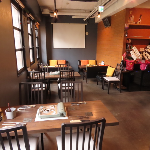 当店は、シックでおしゃれなカフェのようなデザインの空間となっています。スクリーン映像とおしゃれなBGMも流れており、ご友人とのカジュアルな食事はもちろん、パパママもほっと一息、家族でくつろげる雰囲気です!さらにプロジェクターなども利用して、各種ご宴会やイベント事にもぴったりのお店です♪