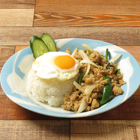 タイ風の鶏そぼろご飯、ガパオライスは香ばしいバジルが香る絶品。目玉焼きとの相性も抜群で、当店オススメメニューです。爽やかなラッシーが食事を引き立てます!