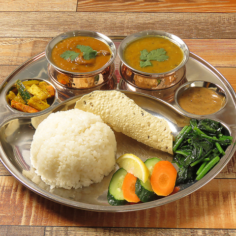 【学生15%off】チキン又はマトンカレー、ダル(豆)カレー、ライス、アチャール、ブテコサグ、パパド、サラダ、ソフトドリンク