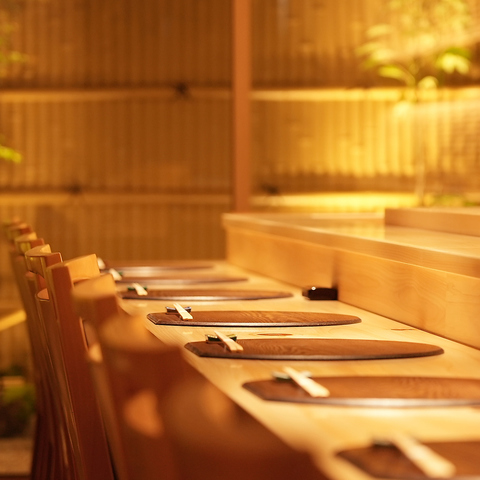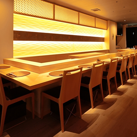木目と温かみのある照明が和やかな空間を演出するカウンター席はデートやご夫婦でのお食事に最適。お買い物や観光後のお食事としてゆったりとした優雅なひとときを演出いたします。目の前では熟練の職人が鮨を握る光景も見ることができ、食欲を一層と引き立てます。
