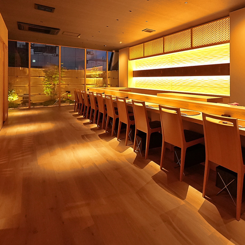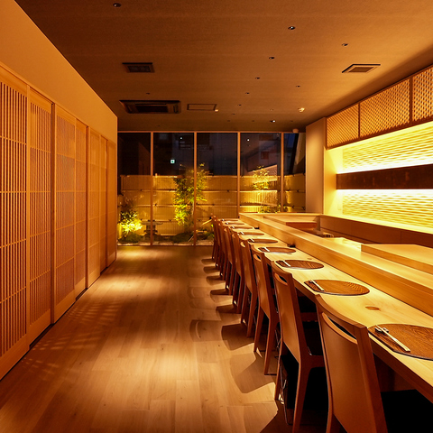 当店は、大人の隠れ家のような空間で、木目を基調とした落ち着いた雰囲気が漂います。大きなガラス窓からは美しい庭園が望め、まるで都会の喧騒を忘れさせるかのよう。カウンター席と掘りごたつ式の個室を完備しており、接待やデート、宴会など様々なシーンでご利用いただけます。