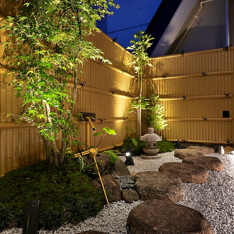 店内から眺める事の出来る庭園は心斎橋に居る事を忘れさせてしまう特別な空間。温かみのある照明と木目を基調とした店内でこだわり食材を使用した料理をぜひ、ご堪能ください。