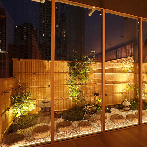 店内は、温かみのある照明が優しく照らし、木目を基調としたデザインが落ち着いた雰囲気を醸し出しています。このこだわりの内装は、食事の愉しみ方を引き立てるために考えられています。また、大きなガラス窓から見える庭園は、心斎橋のビル4階という立地を忘れさせるほどのリラックスした空間を演出。デートや記念日にも最適です。