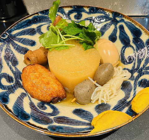 宗田鰹や道南の真昆布からとった出し汁に、鴨の出し汁を加え、深みのある風味豊かなおでん出し汁に仕上げております!