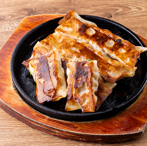 熱々の鉄板に乗って登場!パリッパリの皮にジューシーな餡がたっぷり入っていて、ビールとの相性が抜群!