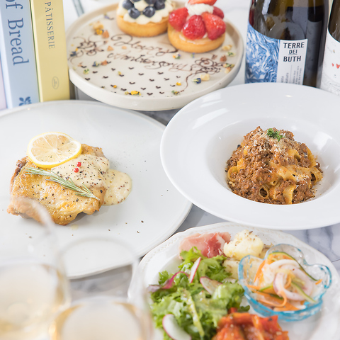特別な日にピッタリのアニバーサリーコース!新鮮な魚のムニエルや、風味豊かなボロネーゼパスタ、彩り豊かなサラダなど、自慢の料理が揃っています。デザートには華やかなタルトが添えられ、幸せなひとときを演出。特別な瞬間を大切にするための、心温まるコースをぜひご堪能ください。※コース内容は変更の可能性あり
