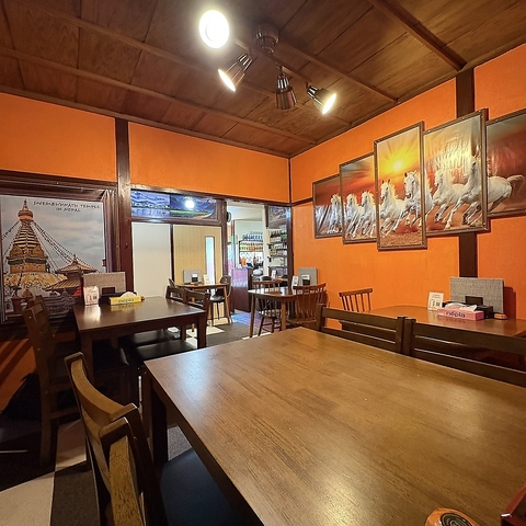 こだわりのある店内の写真です。オレンジの壁や、ガネーシャ像のイラストなど食べておいしい他に、写真撮って楽しんでもらえるような店内です。写真映えする店内で素敵なお食事をお楽しみください◎ 食べ放題・飲み放題のご用意もございますので、お気軽にお越しください!!