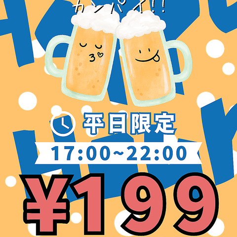 お一人様のサク飲みや女子会にも利用しやすく超お得に!角ハイ、サワー、お茶割、カシスなどなど!199円