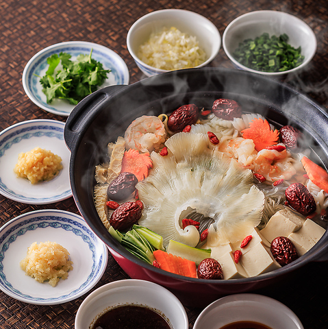 ふかひれや大海老、アオリイカに白きくらげ、春雨など、食材を贅沢に盛り込んだ、具だくさんの特製中華鍋をご用意。海鮮の旨みが絶妙に溶け合う、滋味深い味わいを楽しめます。白ネギ、しょうが、にんにく、青ニラなどの薬味と山椒醤油、潮州辣油醤のタレで、お好みの味にカスタマイズしながらお召し上がりください。
