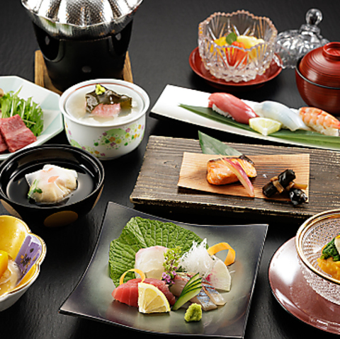全9品で四季を感じる上質なお料理をご提供いたします。また、お食事はプラス500円で寿司3巻を追加することも可能です。その他、贅沢メニューの全9品から構成される会席コース『藤』12,000円(税込)もご用意しております。用途に応じてお好きなコースをお選びください。