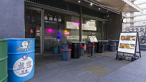 当店の壁には可愛らしいイラストが描かれ、ネオンの光がポップな空間を演出。店内ではK-POPが流れ、リクエストも可能です。テーブル席や屋根付きのテラス席があり、冬はヒーター、夏はクーラー完備で、季節を問わず快適に過ごせます。また、ワンちゃん連れのお客様も、昼は店内、夜はテラス席で一緒にお食事が楽しめます。
