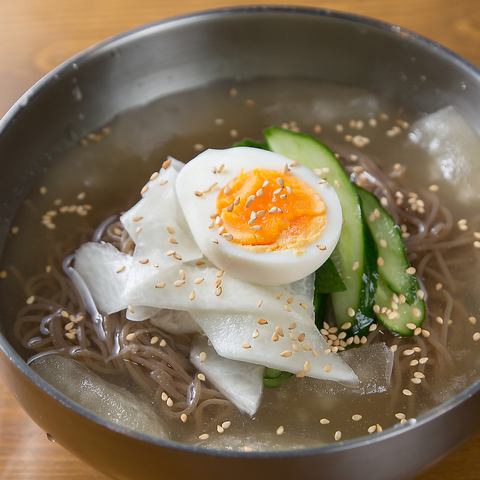 牛胸肉を炊いたユッスというスープに水キムチを入れた水冷麺。酸味のきいたあっさりしたスープにコシのある麺が魅力