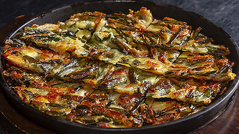 海鮮チヂミは、ニラや新鮮な魚介類をたっぷり混ぜ込んだ生地が自慢です。丁寧に焼き上げられたチヂミは、外側がカリッと香ばしく、内側はもっちりとした絶妙な食感を楽しめます。多めの油で仕上げられたこの一品は、パリッとした食感が唯一無二で、食べるたびに幸せな気持ちが広がります。