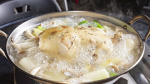 素朴ながらもダイナミックな鶏一羽丸ごと使った鍋料理。数時間煮込み鶏の旨味を活かしたシンプルな味わい。具材は、韓国餅やネギ、ジャガイモ等のお野菜。夏は暑さばて防止、冬はあったか鍋としてコラーゲンやビタミンも豊富で女性様にも人気締めは雑炊やタッカルグクス(韓国うどん)がおススメ