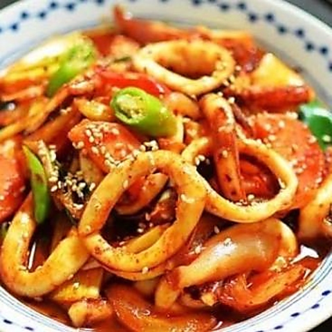 ピリ辛のタレで新鮮なイカを炒めた人気の一品です。