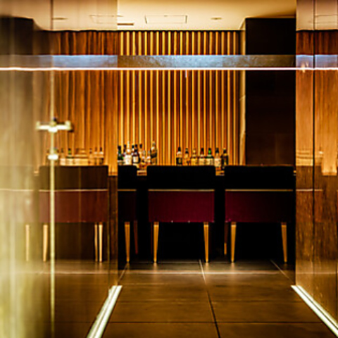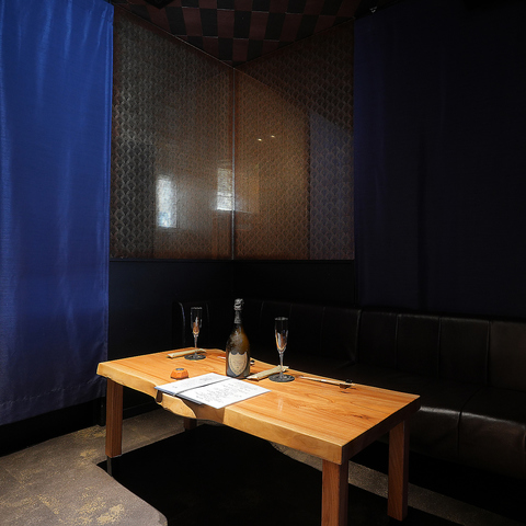 黒を基調に設えられた完全個室は、上質で落ち着いた雰囲気。お手洗いやテレビを備え、喫煙も可能な快適な空間です。接待や記念日など、大切なひとときにご利用ください。※ランチ時は2名様~(個室料なし)、ディナーは3名様~(個室料あり)ご案内いたします。