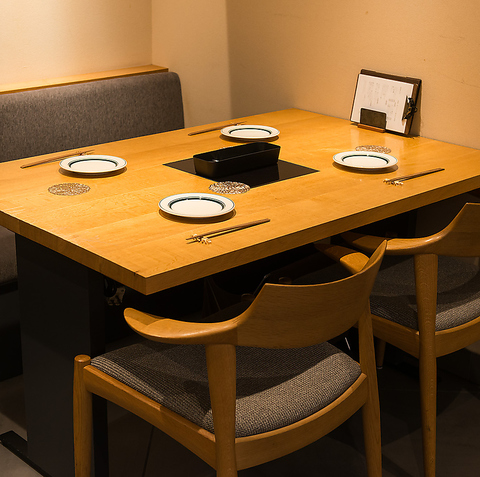 【心温まる落ち着いた空間】友人や家族との楽しい食事を楽しめるテーブル席(4名様掛けを2テーブル)もご用意ございます♪落ち着いた色合いの空間で心地よさを感じていただけます。リラックスした雰囲気の中、お食事をご提供いたします。シェアスタイルの料理囲み、心温まる時間をお楽しみください。