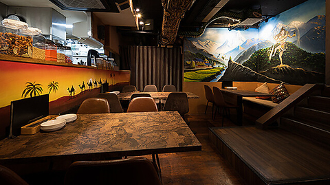 下の階は独特なアートが広がりより魅力的な空間でお酒や南アジア料理をお楽しみいただけます。テーブルもオシャレなデザインを施しており、お料理もよく映えます。ディナータイムはライトを少し落としてより特別感ある雰囲気に♪