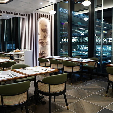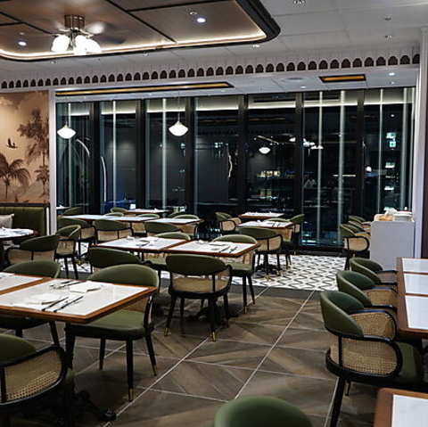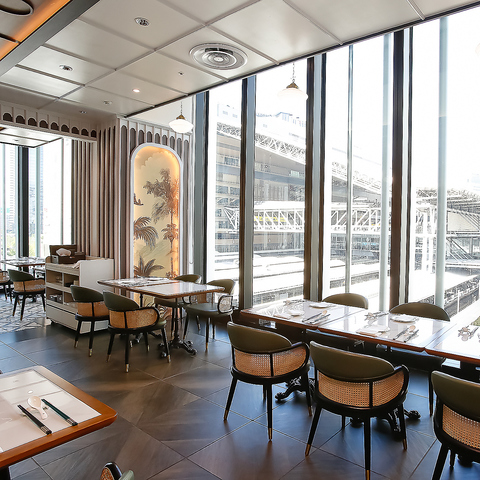 【最大52名様の宴会・貸切・飲み会・パーティー】JR大阪駅を一望できる開放的な店内には、ドレスコードが無く、リラックス出来るラグジュアリーな空間が広がります。内装はシンガポールのデザイナーにより設計されており唯一無二の体験を演出。カジュアルに寛げる、シンガポールらしい雰囲気をお楽しみください。