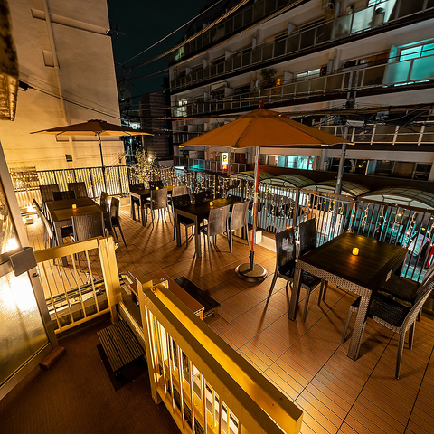 開放感を味わえるテラス席は、外の空気を感じながらゆったり過ごせる特別な空間です。暖かい季節はもちろん、夜風が心地よい時間帯は食事やドリンクがさらに美味しく感じられます。木の質感と柔らかな灯りが合わさり、外でも落ち着いた雰囲気で過ごせるのが魅力。