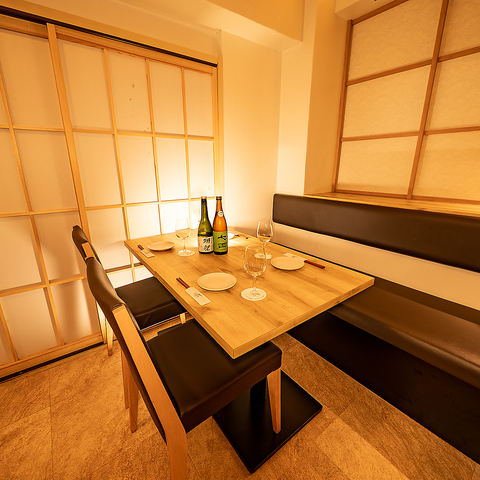 柔らかな灯りに包まれたソファ席は、ゆったりと身体を預けられる心地よさが魅力です。テーブルとの距離感も程よく、料理が並んでも窮屈にならないつくりのため、落ち着いて食事を楽しめます。温かみのある木目と和モダンの空気が重なり、会話が自然と弾む穏やかな雰囲気に。
