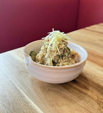 こだわりの日本酒と共にお楽しみいただける料理を多彩にご用意しております。「鮮魚のタルタル」などの前菜をはじめ、肉料理やパスタ、ご飯ものなど様々なメニューをご提供。ただいま期間限定メニューとして、奈良の食材を活かした「鶏肉の奈良味噌焼き」や「鯛のせ三輪にゅうめん」などもご用意。日本酒とのマリアージュをぜひご堪能ください。