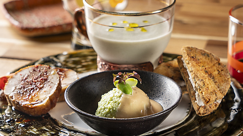 経験豊富なシェフが作るフレンチをメインに、イタリアンや和食など様々なメニューをご提供しております。前菜をはじめ、肉料理、飯物まで豊富なラインナップをご用意。期間限定メニューが登場することもございますので、季節の日本酒とのマリアージュをぜひお楽しみください。