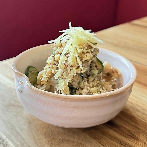 マヨネーズを使わないポテトサラダに自家製で漬け込んだ生姜オイルをお好みでどうぞ