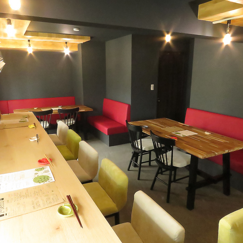 清潔感のある店内は、シックなトーンに赤いソファーが映えるお洒落な内装。あたたかな照明が、居心地の良い大人の時間を演出します。落ち着いて過ごせる癒しの空間で、こだわりの日本酒と料理を心ゆくまでご堪能ください。