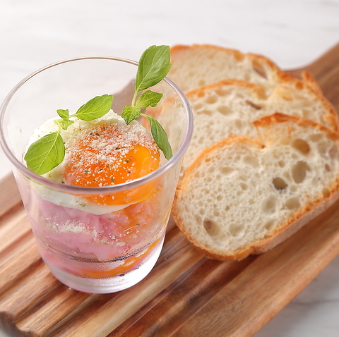 ※パン・ドリンク付き グラスの中でマッシュポテトと半熟卵を合わせた具をすくって食べるアメリカでセレブに人気の朝食です。※パンは全て京都「進々堂」のこだわりパンを使用しております。