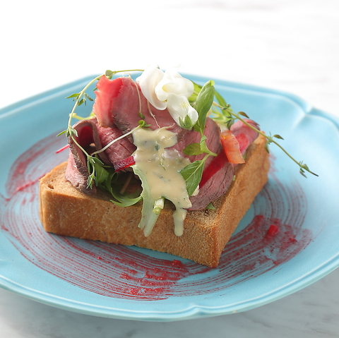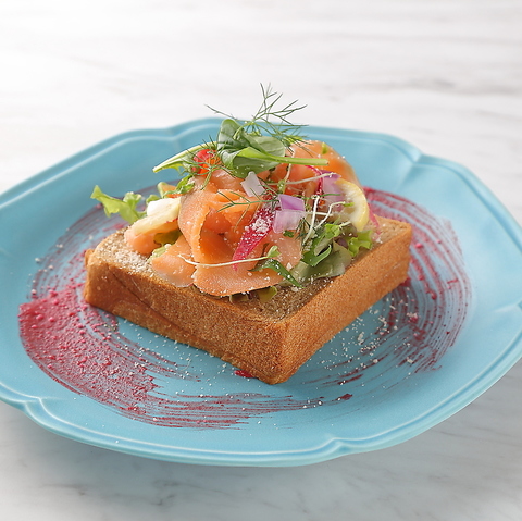 ※ドリンク付き 全粒粉パンの上にローストビーフやスモークサーモン、サラダやエディブルフラワーなどを載せたデンマーク生まれのヘルシーオープンサンド。※パンは全て京都「進々堂」のこだわりパンを使用しております。