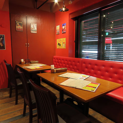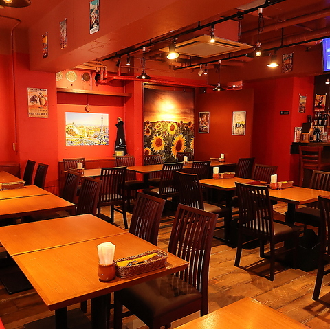 | テーブル | 2名様×8 | 情熱的な赤を基調にした店内は、まるでスペインのバルに訪れたかのような明るく陽気な雰囲気。広々としたテーブル席は、グループ利用にもぴったりで、女子会やご家族でのお食事にもおすすめです。 |
