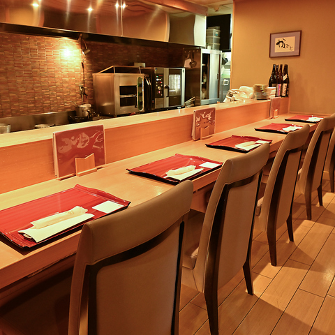 職人の技を間近で見ることができるカウンター席。細やかな技術を見たうえで食す料理は絶品。落ち着いた雰囲気のお店だからこそ、一品一品をじっくりと味わっていただけます。ご家族でのひと時はもちろん、デートや接待など大切な日のお食事におすすめのお店です。
