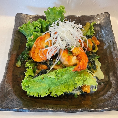 沖縄のブランド豚「琉球あぐー豚」は脂身の味が格別です。そのあぐー豚の生ハムを乗せた贅沢なサラダです。