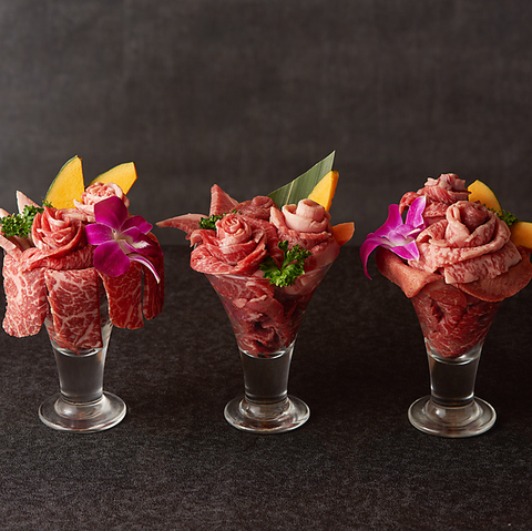 ★厳選された黒毛和牛肉が盛り付けられた肉の「肉パフェ」もしくは「肉ケーキ」をプレゼント♪お誕生日、記念日などにもピッタリです!焼肉屋らしいサプライズはいかがでしょうか☆各種食事会、誕生会ならぜひ「肉屋の台所 」で!