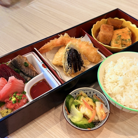 お得なサービスランチは、ご飯の大盛り無料に加え、海老出汁椀やお新香まで付いた満足度の高い内容でご提供。普段使いはもちろん、ちょっとしたランチ会やお昼のお集まりにも最適です。さらに、1日限定10食の「天ぷら&刺身定食」や、新鮮な魚介をふんだんに盛り込んだ「海鮮丼」など、数量限定メニューもご用意してます。