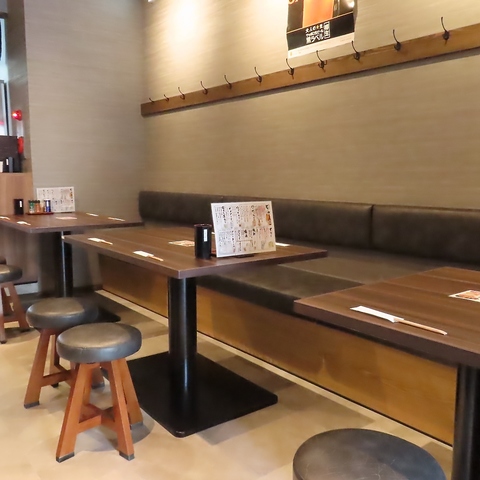 ゆったり寛げるテーブル席をご用意しております。友人や同僚との飲み会利用にもぴったり。木目調の家具が落ち着いた雰囲気を演出しております。奥側はソファーとなっておりますので、広々とお過ごしいただけます。少人数~大人数まで幅広く対応可能♪