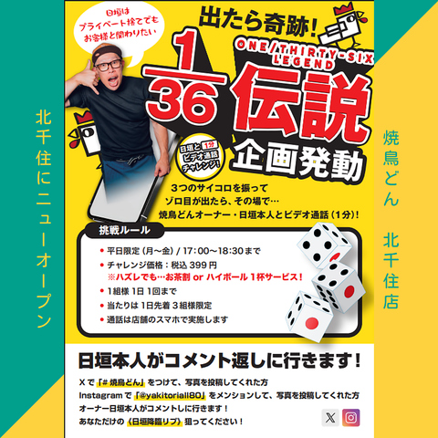 飲食店SNS日本1位!【焼鳥どん】が北千住に爆誕! 5月27日オープンで日垣に合えるかも!!チンチロチャレンジでは1日3組限定で日垣と話せるチャンス!!もちろんお得なチャレンジなので是非トライしてみて下さい!!