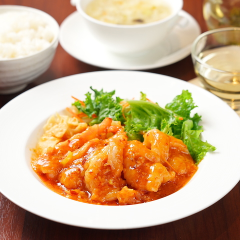 「大海老のチリソース」は、肉厚で甘みと旨味が溢れる最高級の大海老を贅沢に使用した逸品です。ぷりぷりとした食感と海老本来の風味を引き立てる特製のチリソースが絶妙に絡み、食べるたびに幸せな美味しさが広がります。辛さと甘さのバランスが絶妙な一皿です。