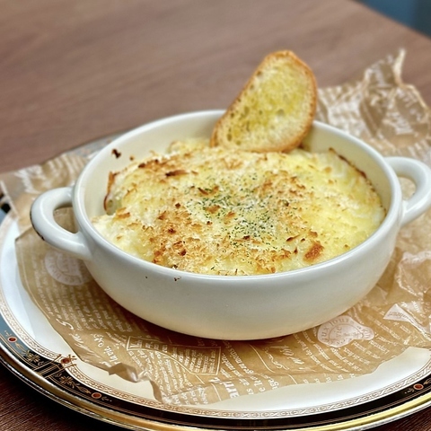 ほくほくのじゃがいもをふんわりと混ぜ合わせ、チーズのコクで包み込むように焼き上げました。表面はこんがり香ばしく、中はとろりとなめらか。口に運ぶたびに、じゃがいものやさしい甘みとチーズの濃厚な旨みが広がります。飾らない美味しさの中に、ほっとする贅沢を感じる一皿です。