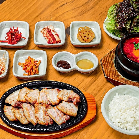 【セット構成:鉄板焼肉+選択メニュー1品+日替わりおかず4種類+ライス+ネギサラダ+サンチュ】■鉄板焼肉メニュー:サムギョプサル・コチュジャンサムギョプサル・プルコギ・チーズタッカルビ ■選択メニュー:純豆腐チゲ・キムチチゲ・冷麺・ビビン冷麺・にっこり冷麺