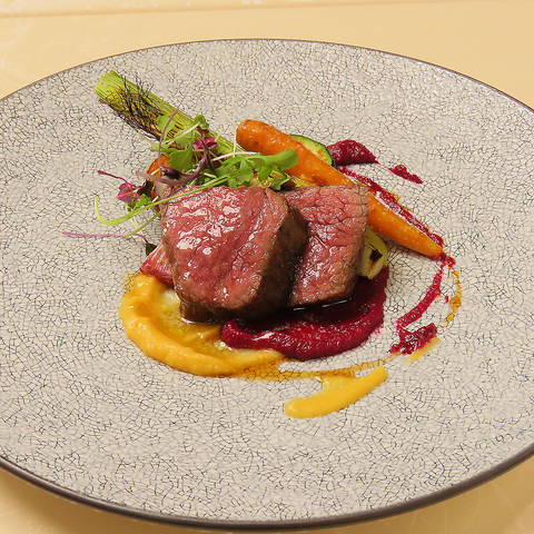 当店自慢の宮崎牛のローストは、厳選された肉質を活かし、じっくりと焼き上げた一品です。付け合わせにはビーツを使用し、見た目にも華やか。アップルバルサミコソースが肉の旨味を引き立て、さっぱりとした味わいで楽しめます。柔らかくジューシーな宮崎牛と、甘酸っぱいソースの絶妙な組み合わせが◎