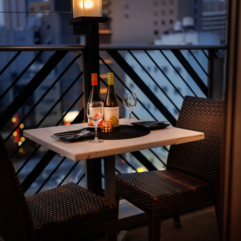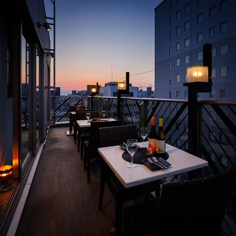 当店のテラス席は、名古屋の空を眺めながら心地よい風を感じられる開放的な空間。昼間は自然光に包まれた爽やかなひととき、夜はライトアップされた雰囲気の中でロマンチックな時間をお楽しみいただけます。宴会はもちろん、カジュアルな食事やデートにも最適。