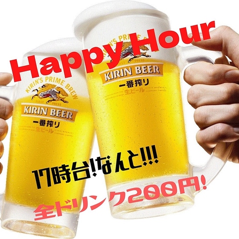 全ドリンク200円で超オトク♪17:00~18:00でハッピーアワー実施中!!