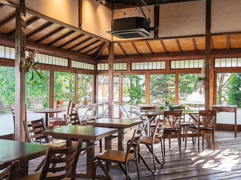 天井まで7メートルもある広々とした空間は、力強い杉の梁に支えられ、訪れる人々に圧倒的な存在感を与えます。元々縁側であった南西に広がる大きな窓から差し込む陽の光は、繊細で女性らしい優しさと、力強さを兼ね備えており、疲れた身体と心を癒してくれます。