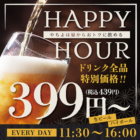 毎日【11:30~16:00】は、ドリンクが全品特別価格!生ビール、ハイボール、カクテル等多数ご用意。