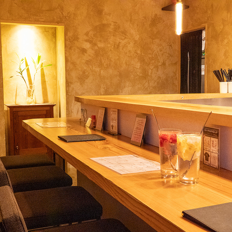 温かな灯りに包まれた店内は、心が安らぐ空間となっています。落ち着いた雰囲気の中で、特別な会話を楽しむ事ができるのが嬉しいポイント。オープンキッチンのカウンター席では、シェフが織りなす料理の技を目の前で体感できるため、視覚的にも楽しめます。親しい友人・知人との集まりや大人数の宴会にも対応できる魅力的な場所となっています♪