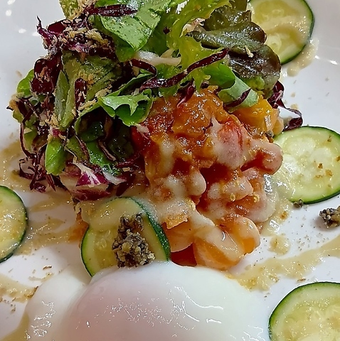 掲載写真は「サーモンのカルパッチョ温玉添え」です。