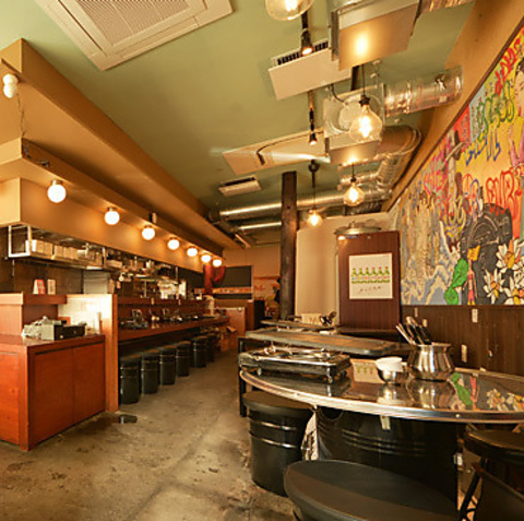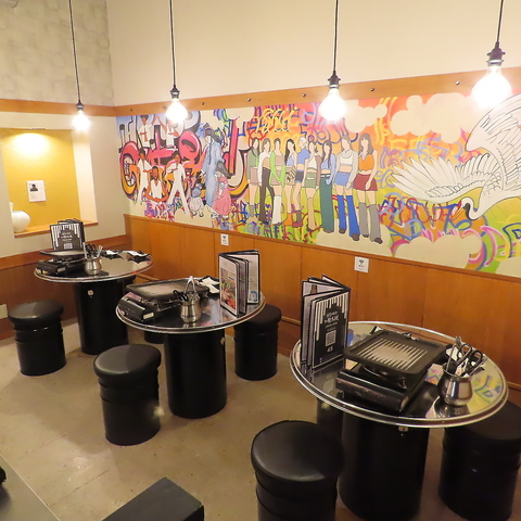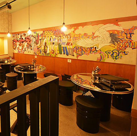 壁に描かれた大きなウォールアートが特徴的な店内は、テーブル席に加え、20名様までご利用いただける完全個室も完備。飲み放題付きのコースもありますので、グループ利用やご宴会にもオススメです!