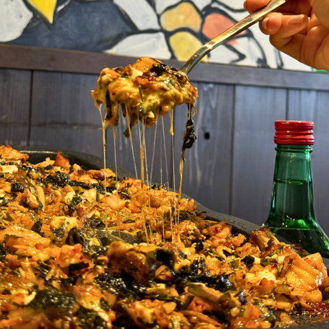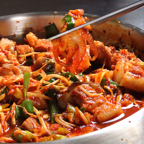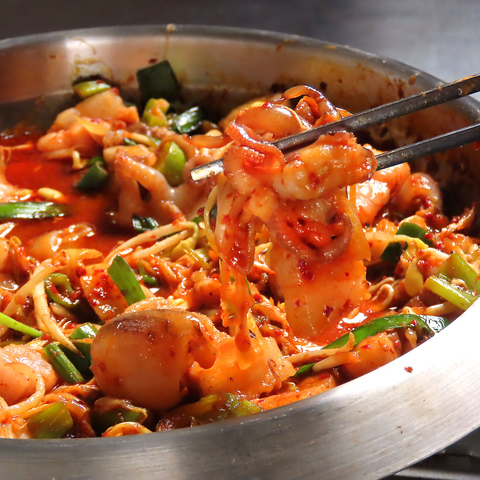 チュクミ(イイダコ)は癖になる食感が◎ 鍋で味付けされたチュクミとサムギョプサルを一緒に食べられる!!サンチュと薬味を合わせてお召し上がり下さい。鍋には盛りだくさんのお野菜とキムチが入っておりボリューム満点です。